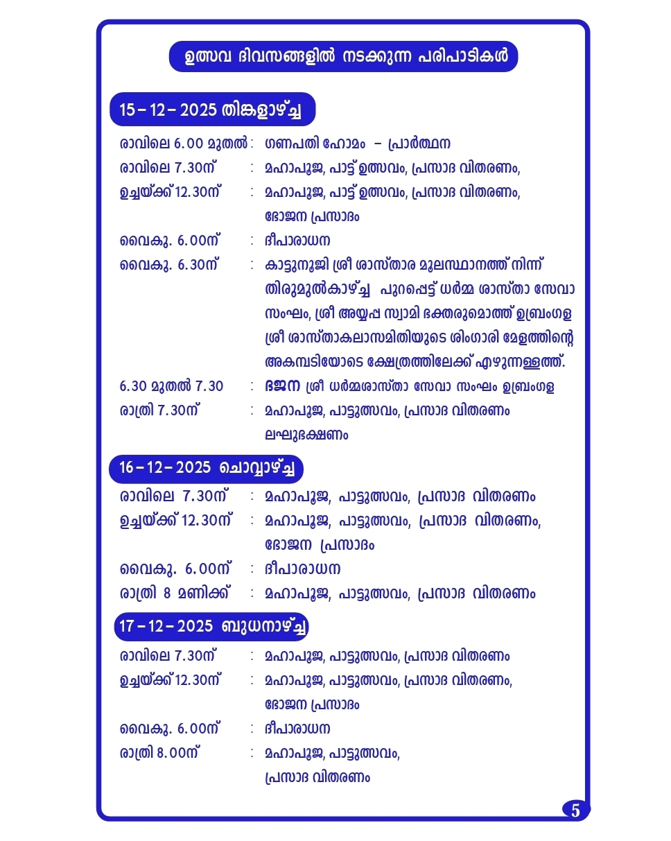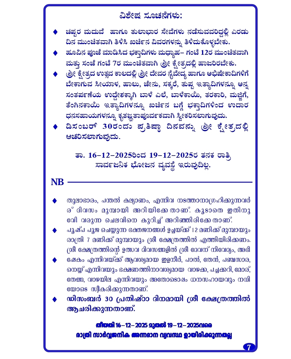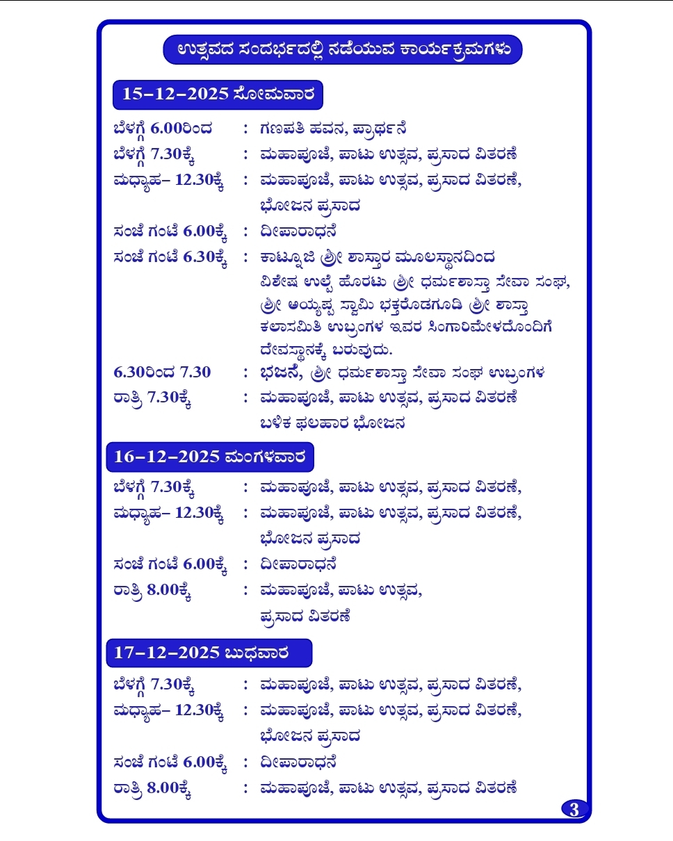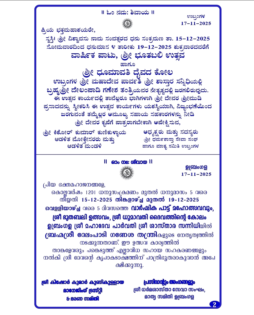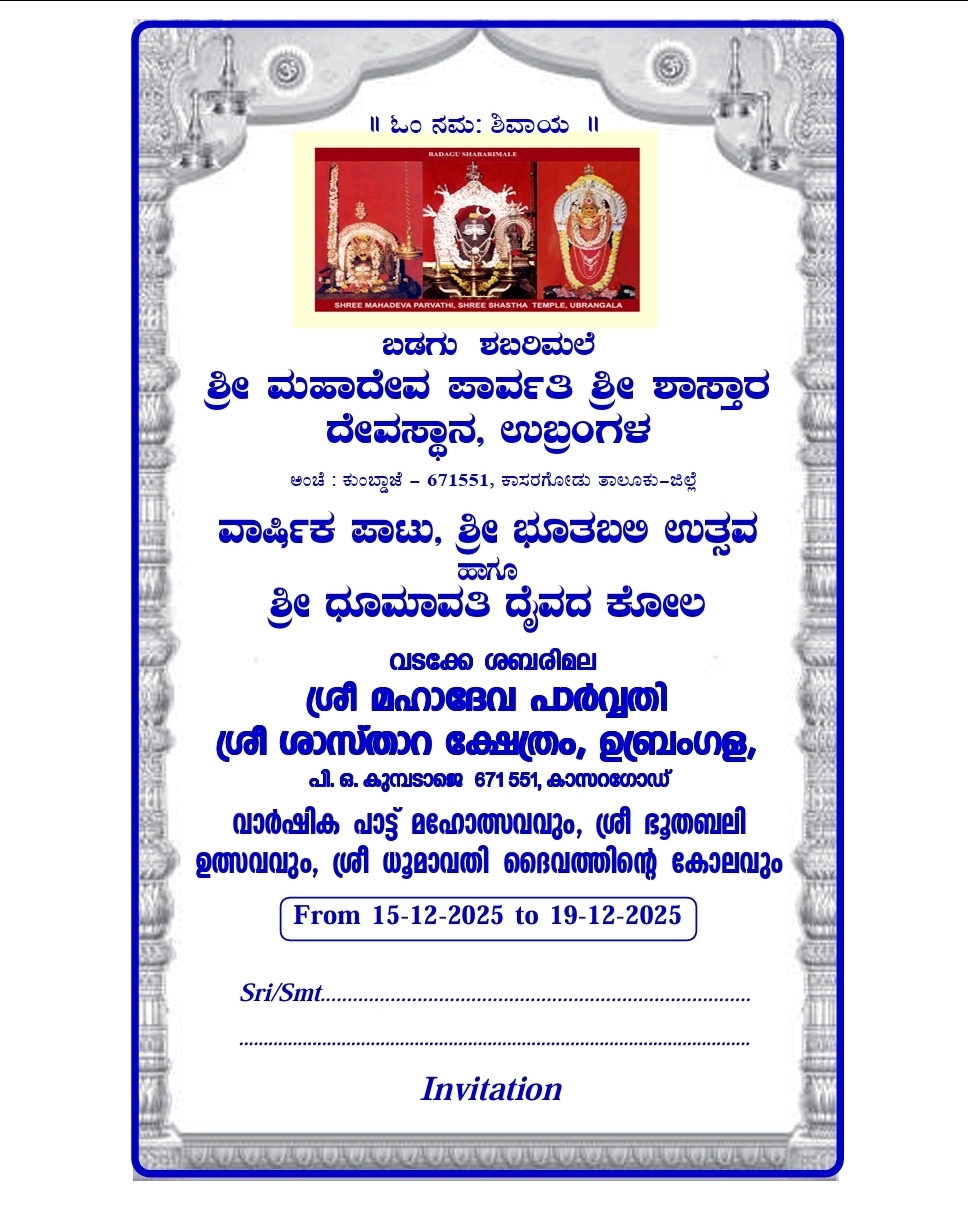 The annual Paatu festival, with Shri Bhoothabali Utsava & Dhoomavathi Daiva Kola will be celebrated from Dec 15th to Dec 19th, 2025 (Monday to Friday).