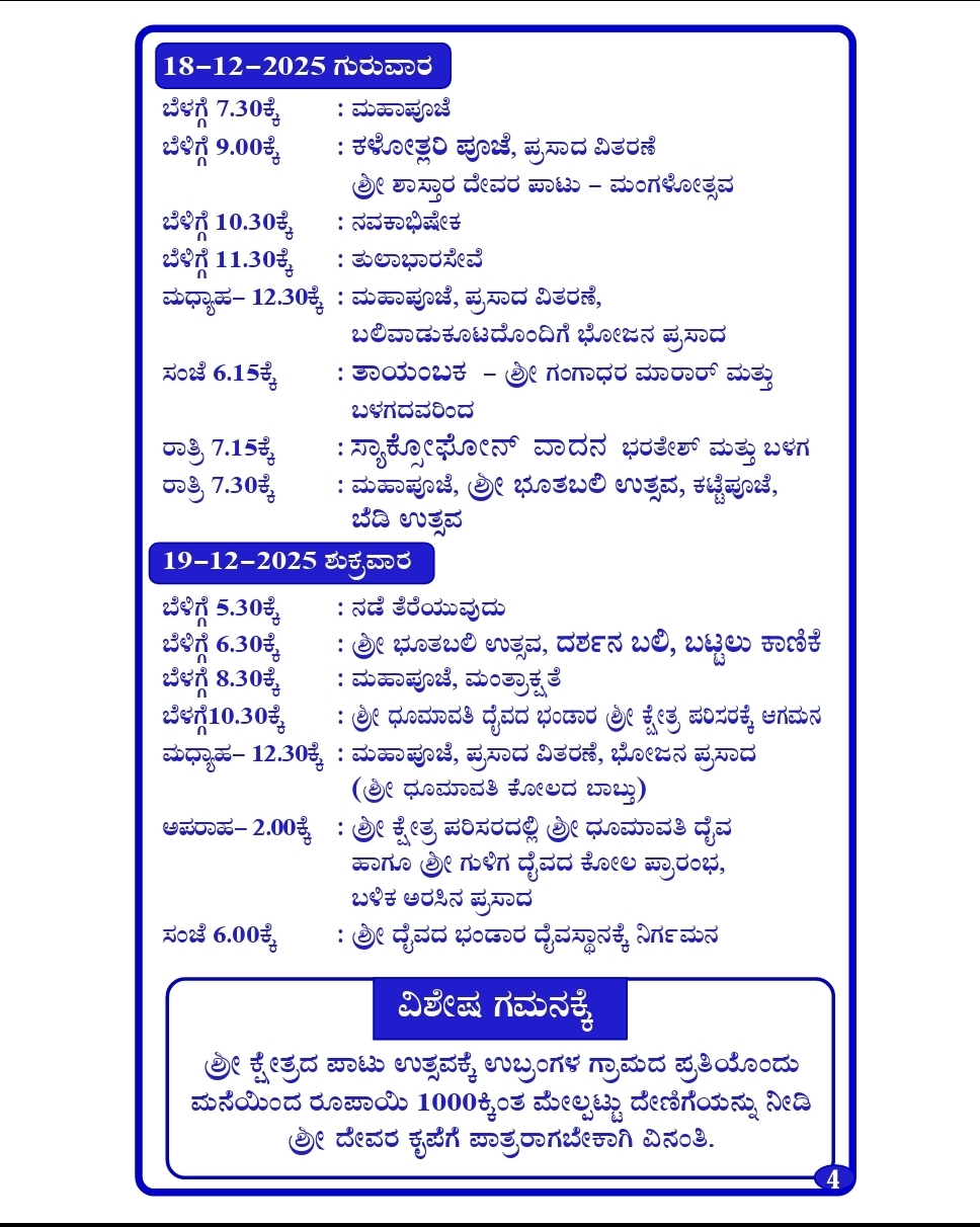 The annual Paatu festival, with Shri Bhoothabali Utsava & Dhoomavathi Daiva Kola will be celebrated from Dec 15th to Dec 19th, 2025 (Monday to Friday).